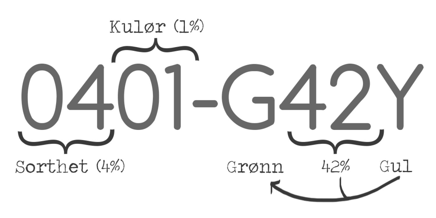 sorthet, hvithet og kulør (fargestyrke). Det er kun sorthet og kulør som angis i koden.